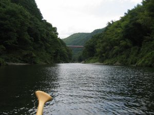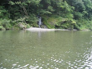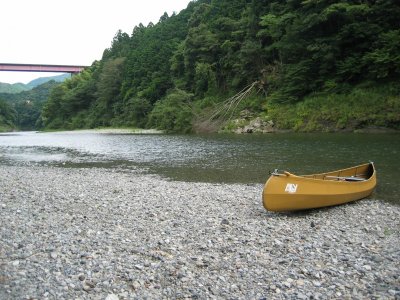 さて念願の三瀬谷湖に、てっちゃんのアーリーのバウに乗り込みパドリングの開始。色々な方のサイトで見ていた三瀬谷ダム湖のイメージとはまったく違い、ごみが多く川が汚れているのいは閉口した。特に雨の後だったのでいつもよりごみが多いとのことだが、とても悲しい気分になった。しかし、20分ほど上流へと進んでゆくと、イメージしていた通りの川底まで透き通った美しい川があらわれ、「これや!これを待ってたんや!」と心の中で叫び、パドルを持つ手にも自然に力が入った。ちょうどいい感じの川原を見つけ、そこで休憩する事となった。akihiro君は平らな小石を見つけては、水切りにチャレンジ!その傍らでてっちゃんが、シングルバーナーをセットし持って来てくれたハムを切って炒めてくれた。そしてこれまた、てっちゃんからの差し入れのノンアルコールビール!たぶんどこにでも手に入るであろうハムも、このシチュエーションで食べると、一流シェフが2〜3日かけて作ったハムにもひけをとらないほど美味しく感じ、その絶品のハムをあてに飲むノンアルコールビールがこんなに美味いとは、はじめて知る感動だった。 楽しいときが過ぎるのは早いもので、そろそろ駐車場へと戻らなければならない時間となる。ところが帰りは強烈な向かい風で、必死で漕いでもなかなか進まない。まるで川が、「もう少し遊んで行けよ。まだ帰るには早いぞ!」と言って、引き止めているような気がした。(出来るだけ、自分に都合の良いように理由付けするようにしています・・・ハイ!)